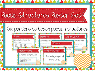 Anyway, for those of you who would like to know about school stuff, my sister-in-law, who teaches fifth grade, asked me to make her some posters for figurative language and poetry structures. The figurative language poster set includes simile, metaphor, alliteration onomatopoeia, personification and imagery.