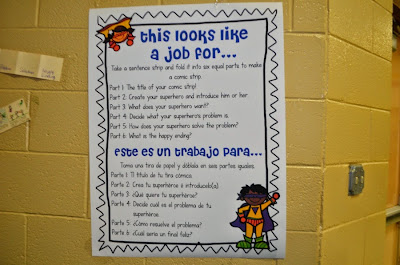 At this station, This Looks Like a Job For..., students used a sentence strip to create a comic book about a superhero!