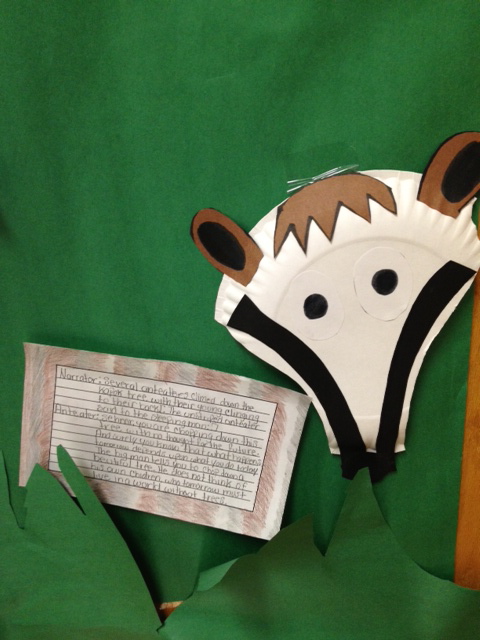 Then, I divided the students up and gave each one a chunk of text that introduced a different animal. I had a small group of students, and there were many animals, so only two students had to buddy up. They wrote their chunk of the story as a drama and published it, using their animal's fur or markings to illustrate the border.