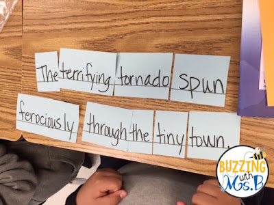 In this station, kids have to engage a lot of different revision skills to create a composition out of sentences. This can easily be written on sentence strips, but I typed this one out and cut it up so we could do it in a small group setting with teacher support. I wanted to use this as an opportunity to review and apply the revision language we'd been using during our writing lessons!