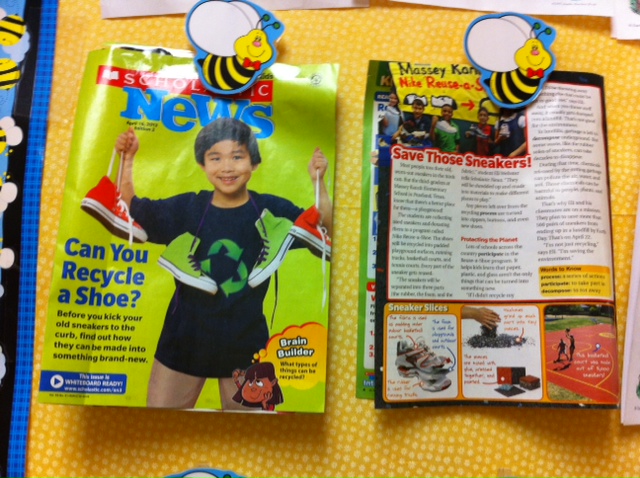It's a Scholastic News about recycling shoes, which apparently is a thing now.