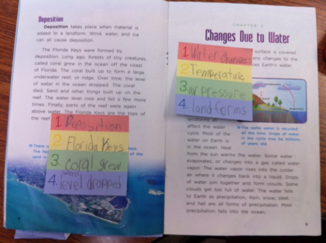 In our small group, each child has a book and a post-it. We look at a paragraph at a time. This page was all about Landslides, as you can see by the heading and photograph/caption. I want kids to start using the features to predict what the section will be about, so we have a conversation. Then I have each student read on his/her own, but seated at the table with me.